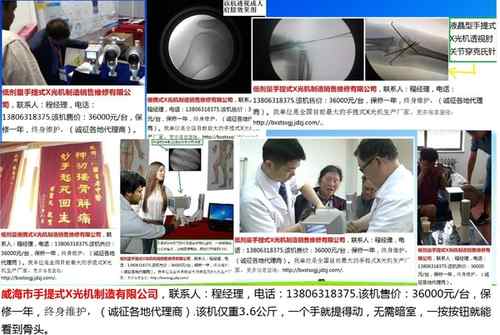威海市手提式X光機制造有限公司,聯系人:程經理,電話:13806318375.該機售價:36000元/臺,便攜式高清DR檢視儀,售價:25萬元/臺,保修一年,終身維護,(誠征各地代理商)。該機僅重3.6公斤,一個手就提得動,無需暗室,一按按鈕就能看到骨頭。低劑量手提式X光機是我單位最早開發研制的高新技術產品,是目前國內外最小的X射線診斷設備.我單位是全國目前最大的便攜式X光機專業生產廠家,三證齊全,品牌:厚華。同時進行X光機的DR升級改造。
